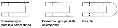 Vous pouvez raccorder des lignes, des droites et des demi-droites même lorsqu'elles sont parallèles. Le rayon du raccord courant s'ajuste temporairement pour créer un arc tangent aux deux objets et situé dans le plan commun à ces objets.