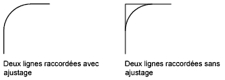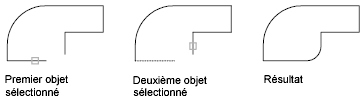 Le premier objet sélectionné doit être une ligne ou une demi-droite, mais vous pouvez choisir une ligne, une droite ou une demi-droite comme second objet. L'arc du raccord est effectué comme indiqué dans l'illustration.