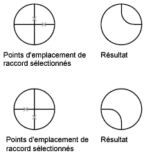 Différents types de raccord sont possibles entre les objets en fonction des points que vous désignez. Comparez les emplacements de la sélection et les raccords obtenus dans les illustrations.