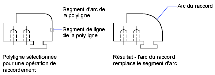 Si deux segments linéaires d'une polyligne sont séparés par un segment d'arc, la commande RACCORD supprime le segment d'arc et le remplace par un nouveau segment utilisant le rayon de raccord courant.