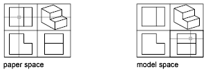 Sur la présentation nommée, utilisez l'espace papier pour créer une présentation finale d'un dessin avant impression. Dans le cadre de la conception de votre présentation, vous créez des fenêtres de présentation, qui contiennent différentes vues du modèle (objet). En passant de l'espace papier à l'espace objet (voir ESPACEO), vous pouvez modifier l'objet et les vues dans la fenêtre de présentation courante.