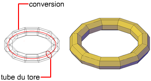 Un tore maillé possède deux valeurs de rayon. L'une des valeurs définit le tube. L'autre valeur définit la trajectoire, équivalente à la distance séparant le centre du tore du centre du tube. Par défaut, un tore est toujours dessiné parallèlement au plan XY du SCU courant.