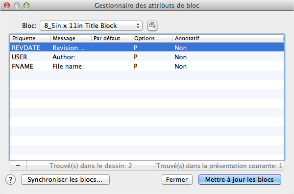 Met à jour toutes les occurrences du bloc sélectionné avec les propriétés d'attribut actuellement définies. Cette opération n'a aucune incidence sur les valeurs affectées aux attributs de chaque bloc.