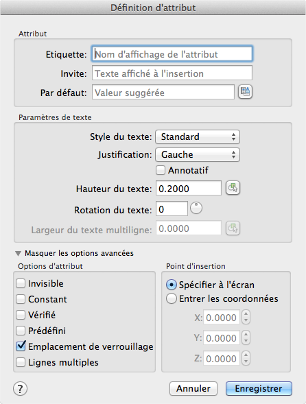 Spécifie les coordonnées à utiliser pour le point d'insertion de l'attribut.