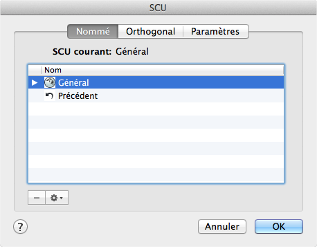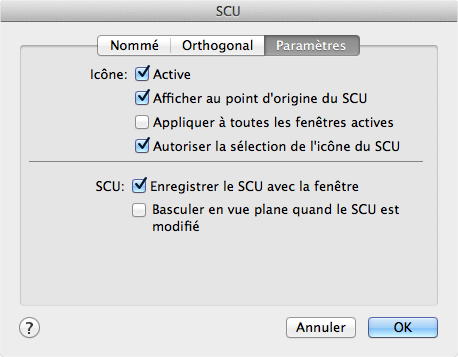Répertorie, renomme et restaure les définitions des systèmes de coordonnées utilisateur et gère les paramètres du SCU et de l'icône du SCU au niveau des fenêtres.