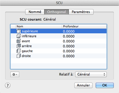 Quand vous modifiez la zone Relatif à, la position par défaut de l'origine du SCU orthogonal sélectionné est rétablie.
