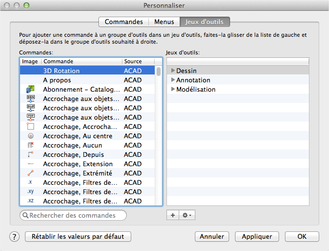 Répertorie les jeux d'outils disponibles dans la palette Jeux d'outils. Développez un jeu d'outils pour voir les commandes, les groupes d'outils et listes déroulantes (également appelées menus déroulant) qui sont affectés au jeu d'outils.