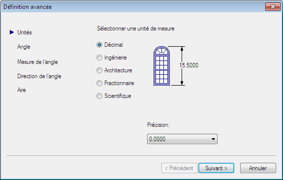 L'assistant Définition avancée comprend cinq pages : Unités, Angle, Mesure de l'angle, Direction de l'angle, et Aire. Lorsque vous travaillez dans cet assistant, choisissez Précédent et Suivant pour passer d'une page à l'autre. Choisissez Terminer sur la dernière page pour fermer l'assistant et créer le nouveau dessin avec les paramètres spécifiés.