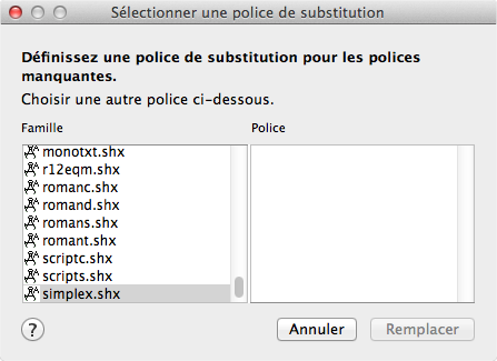 Si vous n'indiquez pas une autre police lorsque vous ouvrez un dessin contenant des polices impossibles à localiser, une boîte de dialogue s'affiche et vous permet d'indiquer une police à utiliser en remplacement de chaque police manquante.