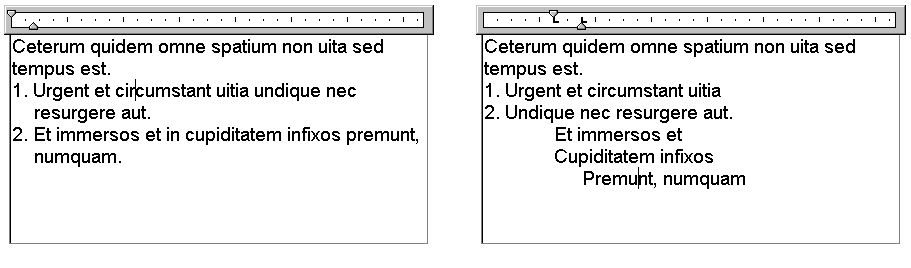 Les curseurs dans la règle indiquent les divers retraits par rapport à la bordure gauche du cadre. Le curseur du haut met en retrait la première ligne du paragraphe ; le curseur du bas concerne les autres lignes du paragraphe.