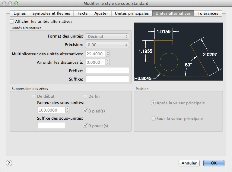 Affiche et définit le format des unités alternatives courantes pour tous les types de cote, à l'exception des cotes angulaires.
