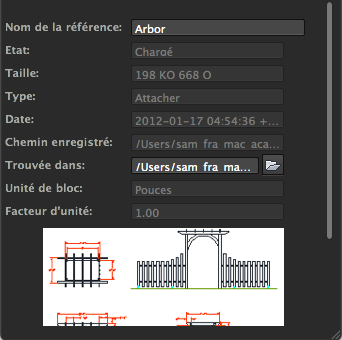 Le panneau des détails et d'aperçu, situé sous le panneau des références de fichier, vous permet d'obtenir des informations à propos de la référence de fichier dans AutoCAD for Mac et du fichier sur le disque.