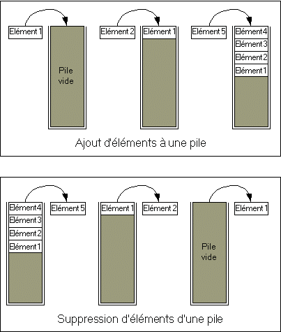 The following figure illustrates adding and removing items from a stack. You can see why a stack structure is often referred to as LIFO—Last In, First Out: