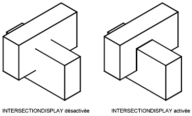 Lorsque vous utilisez la commande CACHER, si la variable système INTERSECTIONDISPLAY est activée, les intersections face à face des surfaces 3D sont affichées sous forme de polylignes.