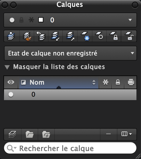 Crée un calque. La liste des calques affiche un calque nommé Calque1. Vous pouvez modifier le nom immédiatement. Le nouveau calque hérite des propriétés du calque sélectionné dans la liste des calques (couleur, état activé ou désactivé, etc.).