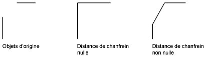 Les distances de chanfrein permettent d'indiquer à quel niveau les lignes se rejoignent ou sont reliées par une ligne de chanfrein ou coupent l'autre objet. Lorsque les deux distances spécifiées sont égales à zéro, AutoCAD LT ajuste ou prolonge les deux objets jusqu'au point d'intersection, sans tracer de ligne de chanfrein. Vous pouvez maintenir la touche Maj enfoncée lors de la sélection des objets pour remplacer les distances de chanfrein courantes par la valeur 0.