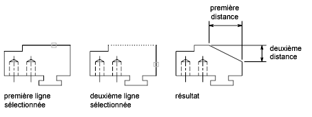 Dans l'exemple suivant, la ligne de chanfrein commence à 1,5 unité de l'intersection sur la première ligne et forme un angle de 30 degrés par rapport à cette ligne.