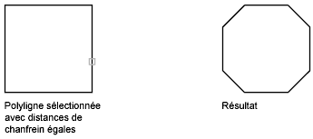 Vous pouvez chanfreiner une polyligne complète en biseautant chacune des intersections. Il est préférable de définir des distances de chanfrein égales.
