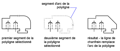 Vous pouvez chanfreiner des segments d'une polyligne qui sont adjacents ou séparés par un seul segment d'arc. Dans ce dernier cas, AutoCAD LT supprime le segment d'arc et le remplace par une ligne de chanfrein, comme le montre l'illustration suivante.