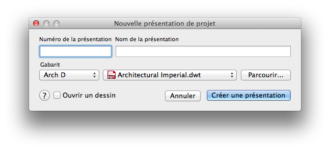 Cliquez sur Parcourir pour sélectionner le fichier gabarit de dessin (DWT) dans le Finder.