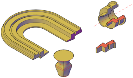 Vous pouvez également combiner des solides 3D à l'aide d'opérations booléennes d'union, de soustraction et d'intersection, par exemple. L'illustration ci-dessous présente deux solides extrudés à partir de polylignes fermées, puis combinés par intersection.