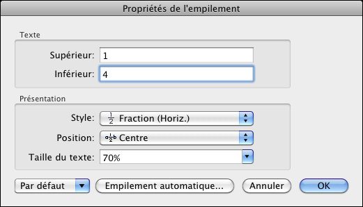 Affiche la boîte de dialogue Propriétés de l'empilement automatique. La fonction d'empilement automatique empile uniquement les caractères numériques situés immédiatement avant et après les caractères accent circonflexe, barre oblique et dièse. Pour empiler des caractères non numériques ou du texte comprenant des espaces, sélectionnez le texte et cliquez sur Empiler dans le menu contextuel de l'éditeur de texte.