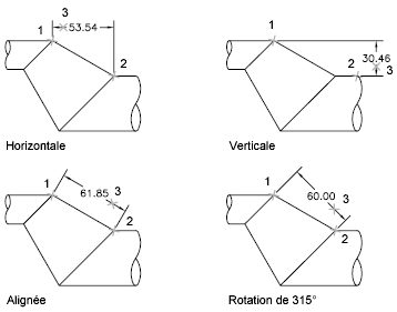 Dans les quatre figures ci-dessus, les points de départ des lignes d'attache (1 et 2) ont été désignés de façon explicite. L'emplacement de la ligne de cote est désigné par le chiffre 3.