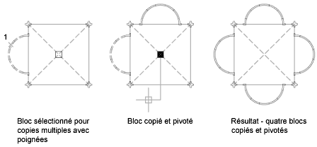 Vous pouvez, par exemple, utiliser l'option Copier pour faire pivoter les objets sélectionnés et en placer des copies à chaque emplacement que vous spécifiez à l'aide du périphérique de pointage.