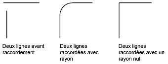 Le rayon du raccord correspond au rayon de l'arc de cercle destiné à relier les objets. Toute modification du rayon du raccord modifie les raccords suivants. Si le rayon de raccord est défini sur 0, les objets reliés sont ajustés ou prolongés jusqu'à ce qu'ils se rejoignent, mais aucun arc n'est créé.