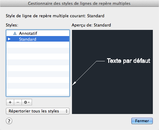 Supprime le style de ligne de repère multiple sélectionné dans la liste Styles. Vous ne pouvez pas supprimer le style en cours d'utilisation dans le dessin.