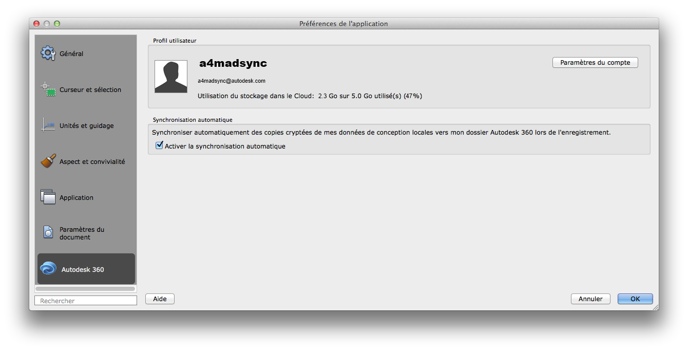 Permet de contrôler les paramètres de votre compte Autodesk 360 et le mécanisme de synchronisation de vos fichiers de conception.