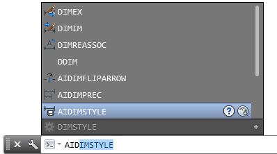 Dès que vous commencez à taper le nom de la variable système ou commande dans la ligne de commande, la fonction de saisie automatique affiche vos choix. Par exemple, si vous entrez dim, toutes les commandes et variables système commençant par ces lettres sont répertoriées comme indiqué.