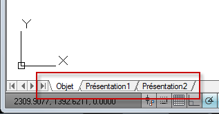 Par défaut, un onglet Objet et plusieurs onglets Présentation nommés sont affichés dans l'angle inférieur gauche de la zone de dessin.