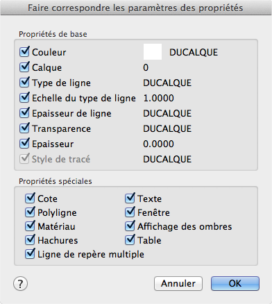 En plus des propriétés d'objet basiques, remplace le style de cote et les propriétés annotatives de l'objet de destination par ceux de l'objet source. Disponible uniquement pour les objets cote, ligne de repère et tolérance.