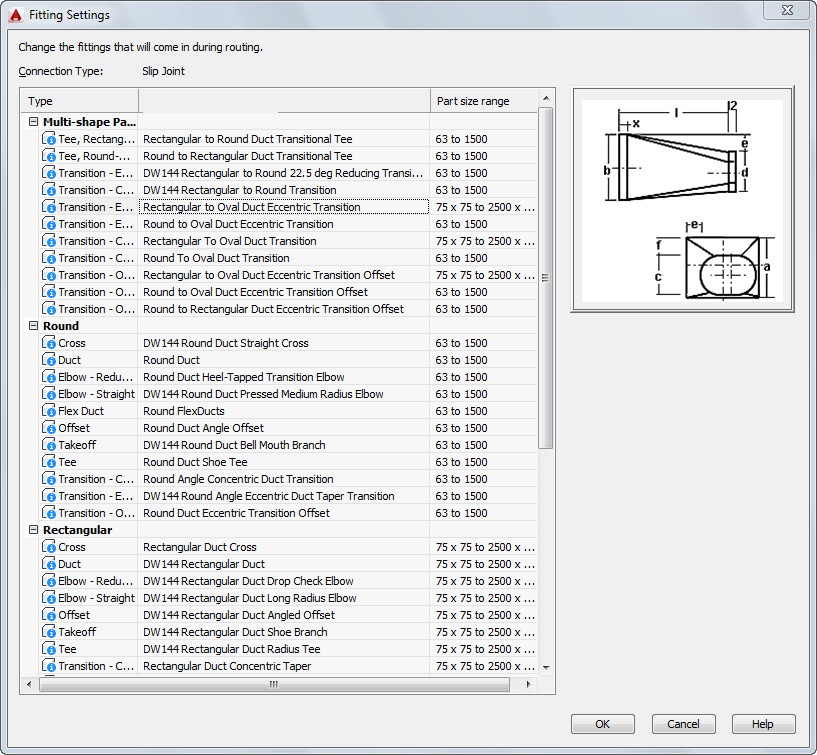 Vous pouvez remplacer une préférence de routage en modifiant le type de connexion et en spécifiant différents composants à utiliser lors du dessin d'une conduite de gaine. Par exemple, si vous souhaitez utiliser des connexions à bride pour une conduite spécifique à la place des connexions à joint coulissant utilisées par défaut, vous pouvez sélectionner l'option appropriée dans le menu déroulant.