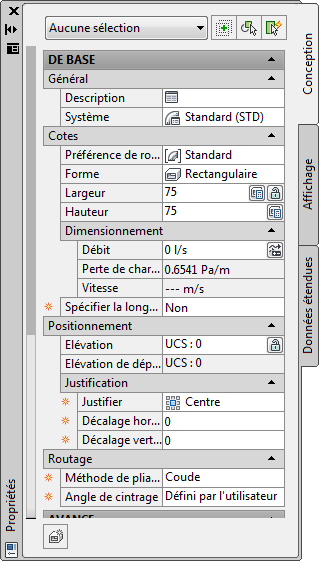 Les tailles des gaines sont déterminées par la méthode d'égale perte de charge ou par la méthode de vitesse constante. Pour plus d'informations, reportez-vous à la rubrique Pour définir le mode de calcul de la taille de la gaine.