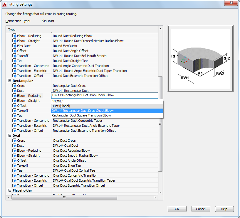 Une préférence de routage de composant de gaine inclut un ou plusieurs intervalles de taille pour les composants de gaine et les raccords, notamment les coudes, les tés, les croix, les piquages et les réductions. Le logiciel organise les intervalles de taille en fonction des tailles nominales des gaines. Vous pouvez utiliser les composants de gaine et les raccords d'un intervalle de taille spécifique lors du positionnement de la conduite de gaine. Les composants de gaines disponibles sont spécifiques au type de connexion que vous sélectionnez. L'exemple suivant montre les préférences de routage pour les connexions de type joint coulissant d'après la forme du profil global.
