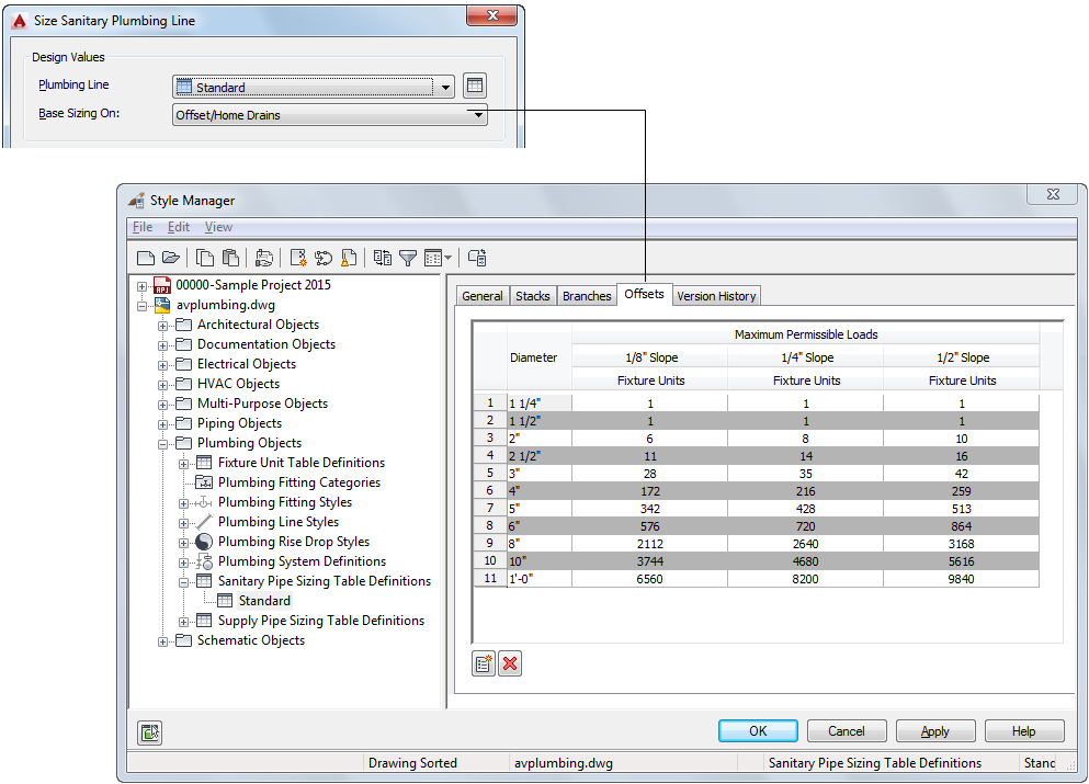 Lorsque vous définissez la conduite sanitaire en tant que décalage ou en tant que tuyaux d'évacuation d'origine, le module de plomberie effectue le calcul de dimensionnement à l'aide des informations de l'onglet Décalages de la table de dimensionnement de ligne de plomberie sanitaire (table de dimensionnement des canalisations), dont les définitions se trouvent dans le gestionnaire des styles.