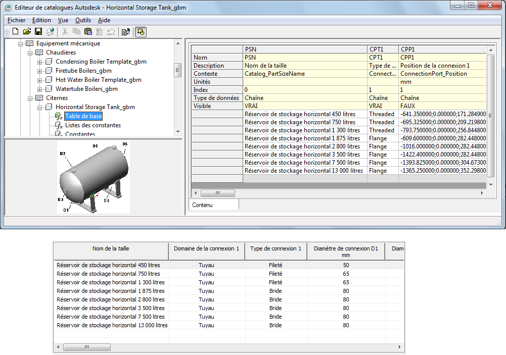 Affichage des tailles de composant dans l'éditeur de catalogues et dans le tableau des tailles de composant de la boîte de dialogue d'ajout