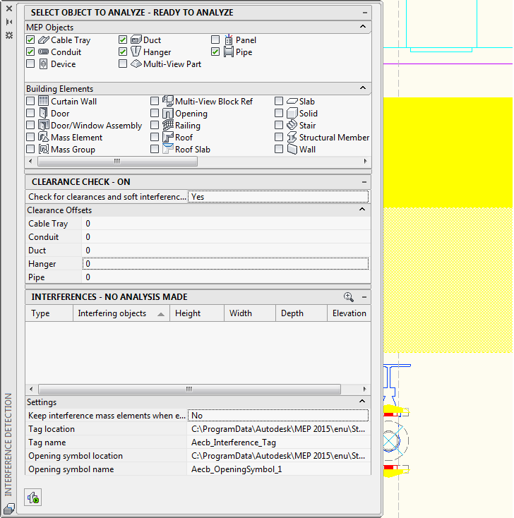 Remarque : Le mode d'analyse des interférences fonctionne indépendamment pour chaque dessin. Si vous accédez à un autre dessin, la palette de détection des interférences est mise à jour avec les informations du dessin actif.