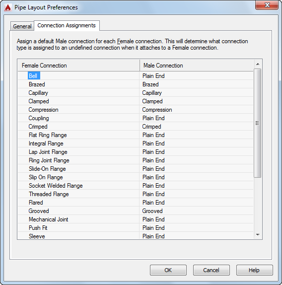 Tout type de connexion indéfini rattaché à un type de connexion femelle dans un dessin s'affiche en tant que connexion mâle et reflète la sélection effectuée dans cette boîte de dialogue.