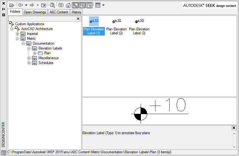 4. Dans le menu Insertion, choisissez DesignCenter et, dans l'onglet Contenu AEC, accédez à l'élément de contenu AEC à partir duquel vous souhaitez créer un outil.