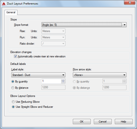 L'onglet Général de la boîte de dialogue Préférences de positionnement de la gaine gère les préférences de pente, élévation, étiquettes, indicateurs de direction du flux et coude.