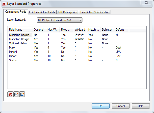 Le logiciel propose plusieurs normes de calques par défaut qui respectent les conventions en vigueur pour les calques (par exemple, MEP Object - Based on AIA et BS1192 - AUG Version 2). Lorsque vous créez un calque basé sur une norme de calque, les différentes parties de son nom sont délimitées par des séparateurs (par exemple, des tirets). Chaque partie du nom est déterminée par les règles spécifiées dans la définition de norme de calque. Les définitions de normes de calques par défaut prévues pour AutoCAD MEP sont conformes aux principales normes industrielles. En vertu de la norme de calque des objets MEP, par exemple, le nom donné aux calques contenant des gaines est M-Duct-Std.