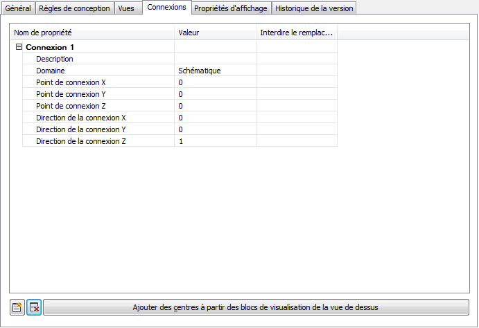 - Indiquez des valeurs dans les champs Point de connexion X, Y et Z ou cliquez sur Ajouter des centres à partir des blocs de visualisation de la vue de dessus pour créer une connexion centrée.
