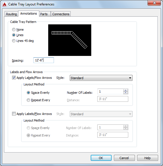 Lorsque vous dessinez une conduite de chemin de câbles, vous pouvez ajouter des étiquettes ou des indicateurs de direction de flux. Vous pouvez également spécifier le motif de hachures à appliquer. Vous pouvez spécifier des lignes verticales ou inclinées à 45 degrés ainsi que l'espacement entre les lignes.