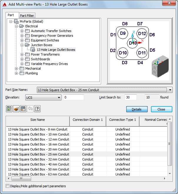 Les boîtes de dialogue Ajouter des pièces à vues multiples et Modification de pièces à vues multiples contiennent également l'onglet Filtre de composant, qui permet de rechercher une taille de composant spécifique en spécifiant les propriétés des composants recherchés. Pour afficher les tailles de composant disponibles dans une famille de composants, cliquez sur le bouton Détails. Pour faciliter le processus de recherche, les tailles de composant disponibles s'affichent sous forme de tableau. Sélectionnez Afficher/Masquer les paramètres du composant supplémentaire pour afficher tous les paramètres dans le tableau.