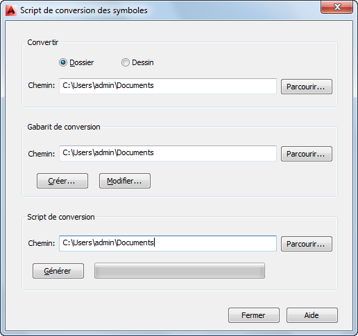 créer un gabarit Cliquez sur Créer. Dans la zone Ouvrir un fichier, spécifiez l'emplacement du nouveau gabarit, puis tapez un nom de fichier. Cliquez sur Enregistrer. Dans la boîte de dialogue Gabarit de conversion, indiquez les valeurs des paramètres du gabarit. Cliquez sur Fermer pour retourner à la boîte de dialogue Script de conversion des symboles.