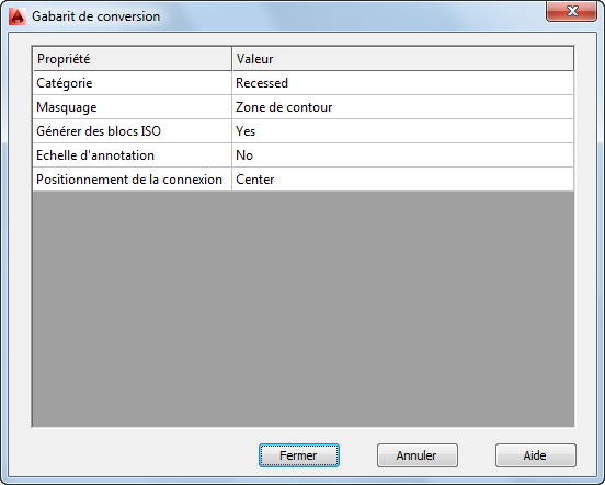 Remarque : Pour modifier le gabarit avant de l'utiliser, cliquez sur Modifier. Dans la boîte de dialogue Gabarit de conversion, modifiez les valeurs des paramètres du gabarit. Cliquez sur Fermer pour retourner à la boîte de dialogue Script de conversion des symboles.