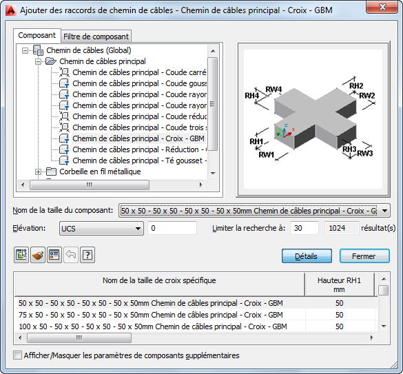 Boîtes de dialogue pour les chemins de câbles et les raccords de chemins de câbles